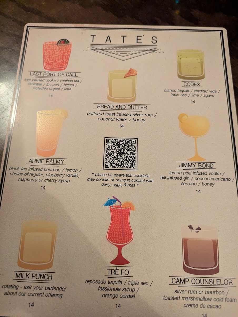 At Tate's Craft Cocktails, located at 279 W 4th St, Winston-Salem, NC, an eclectic blend of flavors awaits you. This charming bar offers a menu brimming with inventive cocktails, each priced at a reasonable $14. Signature drinks like the Last Port of Call and Arnie Palmy embody creativity and craftsmanship, making every sip a delight.